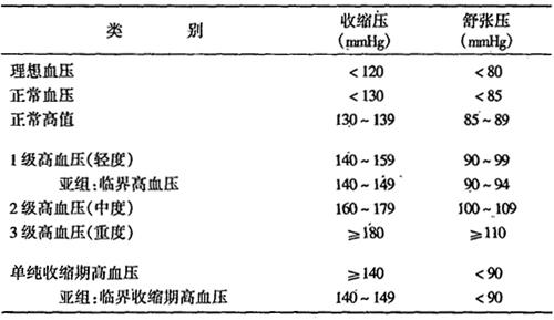 | 释义 | 高血压分类 1.按病因分类:分为原发性高血压和继发性高血压,前者占病人总数的95%以上,病因不明,又称高血压病;后者的高血压继发于其他疾病,有明确病因。 2.按血压水平分类:过去分为轻度、中度和重度高血压。但高血压预后不仅与血压高度有关,还与其他危险因素有关,血压轻度升高并不意味预后一定良好。故现用“级”取代“期”,分为1级、2级和3级高血压(见表1-1)。“级”只表明血压升高程度,不反映病程进展阶段。 表1-1 血压水平的定义和分类