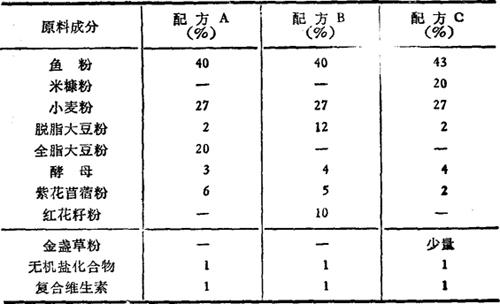 成鳗配方A-C,含蛋白质45-50%,脂肪8-9%,饵料系数3-3.5。 |