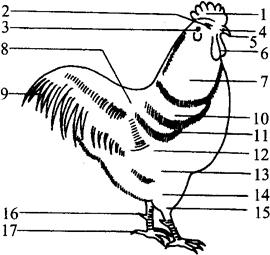 1.冠 2.眼 3.耳 4.鼻 5.喙 6.肉髯 7.颈部 8.背部 9.尾羽 10.肩羽 11.翼羽 12.主翼羽 13.腹部 14.腿 15.小腿 16.距 17.趾