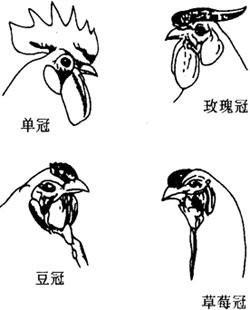 (6)冠 为皮肤衍生物,位于头顶,能表示性征。公鸡冠比母鸡冠大而厚,健壮鸡冠鲜红、肥润、柔软、光滑。冠的种类很多,是品种的重要特征,可分为单冠、玫瑰冠、豆冠、草莓冠。但大多数品种的冠为单冠。鸡的冠形见图3-2。