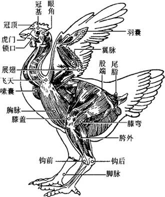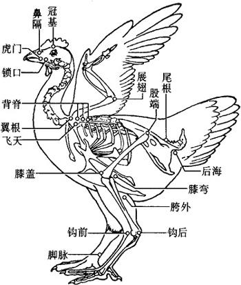 图10.2.2 鸡的骨骼及穴位