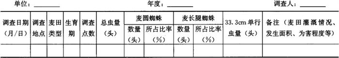 释义 | 麦蜘蛛测报调查方法 我国发生的麦蜘蛛主要有两种:一是麦圆蜘蛛[Penthaleus major(Duges)],属蛛形纲,蜱螨目,叶爪螨科,主要分布于北纬37°以南的地区,如山东、山西、河南、安徽、江苏、浙江、江西、湖北、陕西、四川等地;二是麦长腿蜘蛛[Petrobia lateens(Müller)],属蛛形纲,蜱螨目,叶螨科,分布于河北、山西、山东、河南、安徽、陕西、甘肃、内蒙古、青海、西藏等省(自治区)。 两种蜘蛛主要为害小麦,还能为害大麦、燕麦、豌豆等多种作物和杂草。在大发生年份,麦长腿蜘蛛还为害玉米、大豆、甘薯、花生、绿肥、蔬菜等。 1 主要影响因子 麦圆蜘蛛生育适温为8~15℃,气温超过20℃可大量死亡;空气相对湿度在70%以上,表土含水量在20%左右,最适其繁殖为害。因此,多在水浇地、低湿麦田发生重,干旱麦田发生轻。 麦长腿蜘蛛生育适温为15~20℃,气温超过25℃成虫产卵后死亡。此虫喜干旱,故春雨少、气候干燥年份常猖獗发生;干燥、丘陵、山区和干旱平原地区发生重。 2 调查项目和方法 2.1 系统调查 2.1.1 调查时间 小麦返青后至抽穗期止,每5天调查1次。调查当天在8:00~10:00或16:00~18:00时进行。 2.1.2 调查地块 选择当地往年发生严重、具有代表性的不同生态环境麦田2~3块。每块田面积不少于2×667m2,固定为系统观测田。 2.1.3 调查方法 每块田单对角线5点取样,每点查33.3cm单行长,返青期用目测计数,拔节后将33.3cm×17cm有框固定的白瓷盘或白纸、白塑料布铺在取样点的麦根际,将麦苗轻轻压弯拍打,然后计数,可重复数次,调查蜘蛛种类及其数量。将结果记入麦蜘蛛系统调查表(表4-140)。 表4-140 麦蜘蛛系统调查表 2.2 大田普查 2.2.1 普查时间 根据当地实际发生情况,分别于秋苗期、返青期、拔节期、孕穗期普查4次。每年普查时间应大致相同。 2.2.2 普查地块 选择当地代表性强的不同生态类型麦田10块以上。 2.3.3 普查方法 普查方法同标系统调查。将结果记入麦蜘蛛大田普查表(表4-141)。 表4-141 麦蜘蛛大田普查表 3 预测预报方法 主要依据虫源基数、早春发生量大小,参考天气预报、小麦长势、地势条件等进行综合分析预测。 越冬基数多,越冬虫态成螨所占的比例大,天气预报冬季气温偏高,翌年早春麦蜘蛛可能发生早,且数量多。 早春麦蜘蛛发生基数大,后期发生量相对增多。天气预报若3、4月份温度正常略低,降雨偏多,田间湿度将增大,将有利麦圆蜘蛛发生和为害,尤以长势好、地势低洼田块发生量多。天气预报春暖、干旱、田间湿度低,将有利麦长腿蜘蛛发生为害。 4 测报调查参考资料 4.1 测报资料收集、汇报和汇总 收集小麦主要品种及其栽培面积、小麦播种期和各期播种的小麦面积,当地气象台(站)主要气象要素的预测值和实测值。 全国区域性测报站每年定时填写麦蜘蛛模式报表报上级测报部门。 对麦蜘蛛发生期和发生量进行统计汇总,记载小麦种植和麦蜘蛛发生、防治情况,总结发生特点,进行原因分析。 4.2 发生程度分级标准 麦蜘蛛发生程度分为5级。主要以当地发生盛期的平均虫口密度来确定。各级指标蜘蛛发生程度分级标准如表4-142。 表4-142 麦蜘蛛发生程度分级标准 4.3 防治指标 一般在早春当田间33.3cm单行虫量达200头时需进行防治。 |