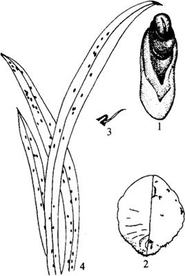 释义 | 黄片盾蚧 【学名】 Parlatoria proteus Curtis。 【分布与为害】 分布陕西、河南、山西及长江以南等地区。寄主有天门冬、墨兰、龙舌兰、朱顶红、苏铁、花叶万年青、花叶芋等。若虫与雌成虫吸食枝叶汁液,造成枝叶衰弱,严重时全株枯死。 【形态特征】 雌介壳长椭圆形,棕黄色,边缘白色或灰白色,壳薄而半透明。第二壳点椭圆形,突出头端,暗色,壳长1.5毫米,宽0.5毫米(图10-9)。雄介壳浅棕色,壳点黑色,长0.8毫米,宽0.25毫米。雌成虫体宽椭圆形,中胸和后胸均较宽阔。触角长,1根刺毛。前气门腺2~5个。体边缘在前气门线上及其前面有圆锥状腺刺。阴门周腺4群,每群4~11个腺体。臀叶3对,发达,第四叶似臀棘。 图10-9 黄片盾蚧 1.雌成虫介壳 2.雌成虫 3.触角 4.被害状 【生活习性】 在南方地区广东等地全年都可见到多种虫态的虫体,以初夏和秋天发生较多,尤以闷热,湿度较大的环境中为害十分严重。 【防治方法】 (1)人工防治。用竹片或粗毛刷刷除虫体。 (2)药剂防治。若虫孵化时,选喷40%氧化乐果1000倍液,或50%杀螟松1000倍,或40.7%乐斯本1500倍液,喷雾。 |