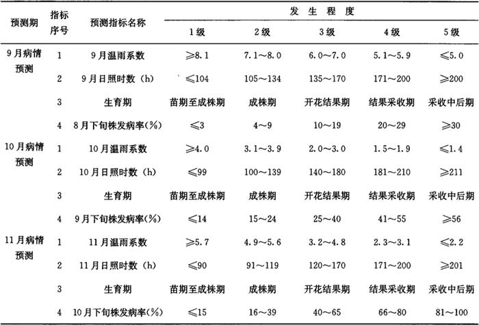 释义 | 黄瓜白粉病测报调查方法 黄瓜白粉病(Sphaerotheca cucurbitae)由子囊菌亚门真菌瓜类单丝壳菌侵染所致。在国内菜区均有分布。除为害黄瓜外,还为害丝瓜、冬瓜、南瓜、西葫芦、西瓜、甜瓜等葫芦科作物,是瓜类作物的重要病害。 病菌以菌丝体和分生孢子随病株残余组织遗留在田间越冬或越夏,也能以菌丝体和分生孢子在寄主上越夏。在环境条件适宜时,分生孢子通过气流传播或雨水反溅至寄主植物上,从寄主表皮直接侵入,引起初次侵染。经5天左右潜育出现病斑,再经7天左右,在受害的部位产生新生代分生孢子,飞散传播,进行多次再侵染,加重为害。适宜发病的温度范围10~35℃,最适发病环境为日均温度20~25℃,相对湿度45%~95%,最适感病生育期在成株期至采收期。发病潜育期5~8天。温度偏高、其他叶部病害发生少、作物采收中后期发病重;连作地、附近有发病较重的菌源田、排水不良、作物生长势不佳的发病较早、较重。种植过密、通风透光差、氮肥施用过多、保护地栽培等往往发病较重。 1 调查内容与方法 1.1 田间病害系统调查 1.1.1 调查时间 移栽定植后20~25天开始至采收结束前5天。 1.1.2 调查方法 选早、中、晚茬口的各主栽品种,利于发病的地势低、种植密度偏高的类型田各2~3块。采用对角线5点取样法,每5天1次,每点定株20株,共取样100株,调查株发病率与病情指数。将每次调查结果汇总填入表6-45。 表6-45 黄瓜白粉病大田系统调查记载表 1.2 大田病情巡回普查 1.2.1 调查时间 从各地黄瓜白粉病进入发生始盛期开始至黄瓜采收结束前10天结束。 1.2.2 调查方法 选进入成株期黄瓜的早、中、晚茬口各主栽品种的类型田各2~3块,调查总田块15块以上。采用对角线5点取样法,每10天1次,每点定株20株,共取样100株,调查株发病率。将巡回普查结果汇总填入表6-46。 表6-46 黄瓜白粉病大田病情普查结果汇总记载表 2 预测预报方法 2.1 病情趋势预报 主要根据田间系统调查的发病率、田间其他叶部病害发生的轻重、是否选用广谱性杀菌剂、中长期天气预报的温雨系数、作物的感病生育期等推测预报发生趋势。 2.2 短期防治预报 根据当前的发病率、病情指数、近期天气是否适宜发病的天气等情况,发布防治预报。 3 测报参考资料 3.1 病情指数分级标准 ◆0级:全株无病; ◆1级:全株1/4以下的叶片有少数病斑; ◆2级:全株1/2以下的叶片有少量病斑或1/4以下的叶片有较多的病斑数; ◆3级:全株3/4以下的叶片发病或部分叶片变黄枯死; ◆4级:全株3/4以上的叶片发病或1/4以上叶片变黄枯死。 3.2 大田病情巡回调查分级标准 ◆0级:无病; ◆1级:株发病率≤25%; ◆2级:株发病率25.1%~50%; ◆3级:株发病率50.1%~75%; ◆4级:株发病率≥75.1%。 3.3 防治适期 防治适期为发病始见后7~10天或田间株发病率5%~8%。进入生长盛期至采收中后期前的各型大田。 3.4 黄瓜白粉病的适宜发病条件 最适发病环境条件:温度20~30℃,相对湿度90%~100%。连续闷热天气,温雨系数5.5以下。 发病潜育期:5~7天。 最适感病生育期:开花坐果至采收期。 3.5 秋黄瓜白粉病的测报预警参数 注:上海市蔬菜科学技术推广站 2004。 |