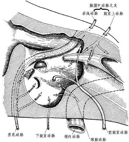 释义 | 鼓室血管供应和神经支配 一、动脉(图4-13) 图4-13 动脉 鼓室动脉网在底板、鼓岬、前壁和后壁下1/2处特别密集。 包括: 1 .颈内-鼓动脉:是颈内动脉内岩动脉的升支分出的。常分成两支,该动脉藏于一个水平管内。通过鼓室前壁并潜于前壁和内壁的下半部。 2.下鼓室动脉:邻近后裂孔自咽升动脉分出。进入鼓室管分布于下鼓室壁处,止于鼓岬部,由此供应底板和咽鼓管鼓口处。 3 .茎乳动脉:来自耳后动脉和枕动脉。进入面神经管穿经茎乳孔与面神经干并行。分出穿通支供应鼓室后壁、鼓窦口槛、镫骨肌及鼓索神经(后鼓室动脉)。 4.脑膜中动脉:岩浅动脉伴同岩大浅神经进入岩大浅管裂孔,然后与茎乳动脉在面神经管内相互吻合,发出分支供应上鼓室内壁黏膜。上鼓室动脉伴同岩小浅神经进入岩小浅神经管裂孔,发出分支供应上鼓室内壁、天盖及锤骨肌。 5 .前鼓室动脉:出自颌内动脉。贯穿岩鼓裂并行于鼓索前管,在此分出3小支供应鼓室外壁和天盖及下鼓室底的外半部。 6.耳深动脉:颌内动脉之分支(Nager神经)。穿经外耳道底,供应鼓室及其外壁。 7.咽鼓管支:来自咽升动脉,供应鼓室前壁。 所有的这些小动脉相互吻合在一起,形成一个血管网袢,由此再分出:①骨营养动脉;②黏膜营养动脉。 二、静脉 静脉比动脉粗且多,与动脉并行。收集血液汇入翼静脉丛和咽丛,脑膜中、岩上窦、颈静脉球及颈动脉管周静脉中,后者尚存在争论。 三、淋巴 不太清楚,收集淋巴流入腮腺淋巴结和耳后下淋巴结以及咽后和乳突淋巴结。 四、神经支配 感觉和副交感神经支配是由鼓室神经承担的。交感神经支配是由鼓室-颈内动脉神经、颈动脉周神经丛来保证的。 |