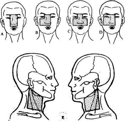 释义 | 鼻腔筛窦癌 临床上较常见,占头颈部恶性肿瘤的第五位。大多数为分化较好的鳞癌,对放射线抗拒性较强,单纯放射治疗难以达到根治,因此,多采用术前和(或)术后放疗。对未分化或低分化癌可首选单纯放疗。 不同的发病部位及侵犯程度,临床上常采用不同形状的照射野。病变限于同侧的鼻腔筛窦者可采用面前“L”形野,包括眉弓连线,同侧鼻腔筛窦,对侧过前中线1~2cm。同侧上颌窦内壁或全上颌窦受侵者,射野应包括全上颌窦。双侧上颌窦内壁均受侵者,多采用品字形射野。如果病变范围更广,如侵犯双侧后组筛窦,眼眶内壁者应设面前较大的方形野(图5-4)。低分化或未分化癌单纯放疗总量要达5000~6500cGy/5~7周,鳞癌尤其是高分化腺癌及腺样囊性癌应采取术前或术后放疗。术前放疗应休息2~3周再手术。 图5-4 鼻腔筛窦癌常用照射野 A:鼻腔、同侧筛窦矩形照射野适用于一侧鼻腔、筛窦受侵 B:面前‘L’形野,适于同侧上颌窦内壁受侵 C:面前‘品’字形野适于同侧和(或)双侧上颌窦受侵 D:面前方形野.肿瘤位于一侧和(或)双侧后组筛窦以及同侧眼眶、球后受侵 E:上中颈转移淋巴结切线照射野 鼻腔筛窦癌总的5年生存率为40%。单纯放疗者为37%,综合治疗者可达50%左右。 |