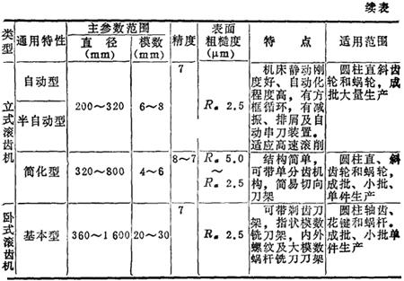 释义 | 齿轮加工机床 齿轮加工方法有车削、刨削、铣削、磨削等,因而齿轮加工机床有滚齿机、插齿机、剃齿机、珩齿机、车齿机等,也包括各种锥齿轮加工机床及齿轮检查机。 1.滚齿机(Y3)(表14-113) 表14-113 滚齿机类型及加工特性 2.插齿机(Y5) 插齿机的结构均为立柱式。插齿主轴作纵向往复运动。 按类型分为基本型插齿机、非圆齿轮插齿机、人字齿轮插齿机及齿条插齿机。各种基本型插齿机,工件直径160~3500mm。插齿模数3~16mm,齿形的表面粗糙度Ra为2.5μm。改换螺旋导轨可加工斜齿轮,安装专门附件可以加工轴齿轮、齿条、扇形齿或其他特殊形状的齿轮、凸轮等。 3.剃齿机(Y4) 剃齿机分卧式、立式两类。卧轴剃齿机为基本型,加工齿轮直径30~450mm,齿轮模数1~8mm。立轴剃齿机适用于较大工件,加工齿轮直径200~1250mm,可以加工内啮合齿圈,齿轮直径最小为600mm。此外,还有轴轮剃齿机、珩齿机。 |