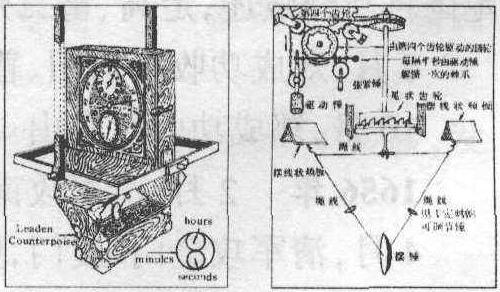 惠更斯发明了能在海上指示标准时间和确定经度的船用钟(图)。其钟摆采用“V”字形双线悬置的方式,可以在一个平面上自由地按周期摆动,周期每摆为半秒;在悬线上装有能上下移动的可调节重锤,以调整走速;悬线采用摆线状夹板,以保证钟的摆锤做等时摆动,联接在相等的时间内吊起的摆锤的发条,组成了杠杆节摆。