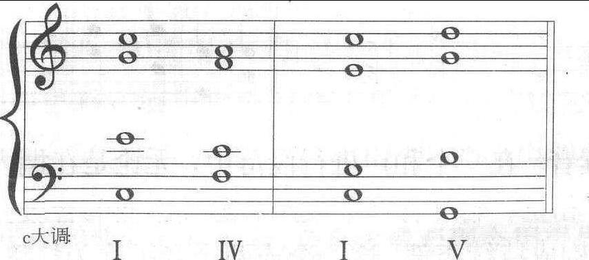 旋律连接法是即使两个和弦有共同音也不保持在同一声部,低音做不超过四度的进行,上三声部与低音反向级进进行。两个和弦均重复根音,连接后不改变和弦的排列方式。旋律连接法的学习通常从大小调的主和弦与属和弦主和弦与下属和弦及下属和弦与属和弦的连接入手。如下: