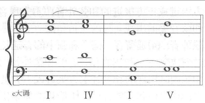 例: 和声连接法 C大调Ⅰ—Ⅳ Ⅰ—Ⅴ保持音在不同声部