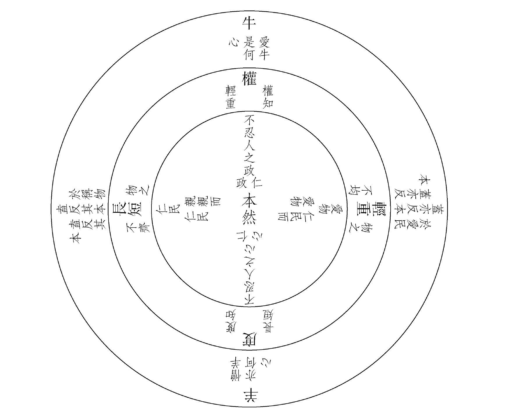 释义 | 12_006心以權度仁民愛物輕重長短之圖 心以權度仁民愛物輕重長短之圖吁!先王有不忍人之心,行不忍人之政,治天下可運於掌。何則?仁心為王政之本,仁政為王教之端。故堯舜之仁心無非行王政之本也,湯武之仁政亦無非遵王教之端也。何以明之?親親而仁民,則天下之人歸仁矣;仁民而愛物,則天下之物亦歸仁矣。如或急於愛物而緩於仁民,則長短失度而徒有仁聞矣。先於仁民而後於親親,則輕重失權,而徒有仁心矣。然則仁心、仁聞不足行王政、遵王教,而仁心、仁政皆由親始,故未有仁而遺其親者,未有義而後其君者也。如之何齊之宣王一何愛憎之偏也?牛,王之物也;羊,亦王之物也。仁心發於見牛,則仁心亦可忍於殺羊也。若然,則‘牛羊何擇焉’?以小易大,百姓雖不知見牛未見羊,是乃仁術也。孟子所以推廣為仁之術者,此正啓發其善心而導之也。宣王之仁心急於物而緩於民,宣王之仁聞先於物而後於民也。故仁民之心輕且短,愛物之心重且長也。重長處而輕短,輕短處而重長者,此失仁心之本。孟子所以‘盍反其本’者,此也。於民則可以重長,於物則可以輕短。故重長處而重長,輕短處而輕短者,此亦孟子所以‘蓋亦反〔其〕本矣’。大凡‘物之不齊,物之情也’。物之不均,亦物之情也。‘權,然後知輕重;度,然後知長短’,而有甚於此者,則心也。心者,本然之權度也,願王度之。仁民愛物,皆由此心之發,則正有甚於物之權度也。以本然之權,權仁民愛物之輕重,則王之仁民輕而愛物重也;以本然之度,度仁民愛物之長短,則王之愛物長而仁民短也。何以則得其輕重長短之適中也?稱愛物之重,反本於仁民之輕,則輕重合權矣。尺愛物之長,反本於仁民之短,則長短合度矣。然後‘親親而仁民,仁民而愛物’也。於斯焉,仁心行於施為之所發;於斯焉,仁政發於見聞之所及。故見牛而此心已發,未見羊而此心無傷也。推此愛物之心以擴仁民之心,則雖有百姓之言不為害也。老老幼幼,親親也;刑妻御邦,仁民也;見牛未見羊,愛物也。王何不反其本矣?‘輿薪之不見,為不用明焉;百姓之不見保,為不(推)〔用〕恩焉。’王之不王,豈挾泰山超北海之類?王之不王,是為長者折枝之類也。‘恩足以及禽獸,而功不至於百姓者,獨何歟?’王‘亦反其本矣’,本者,王政之本也。仁民愛物為王政之本,故孟子七篇,莫非仁義。則‘仁者,心之德,愛之理;義者,心之制,事之宜也’。梁惠王上下既為仁義之行用,則好勇、好貨、好色之喻,亦莫非反本之義也。學者其致思焉。 心以權度仁民愛物輕重長短之圖 ☚ 12_005梁惠王上下為七篇行用之圖 12_007浩然一氣充塞天地間圖 ☛ |
