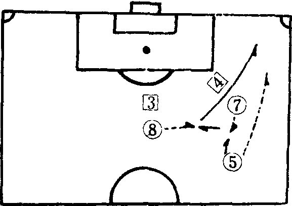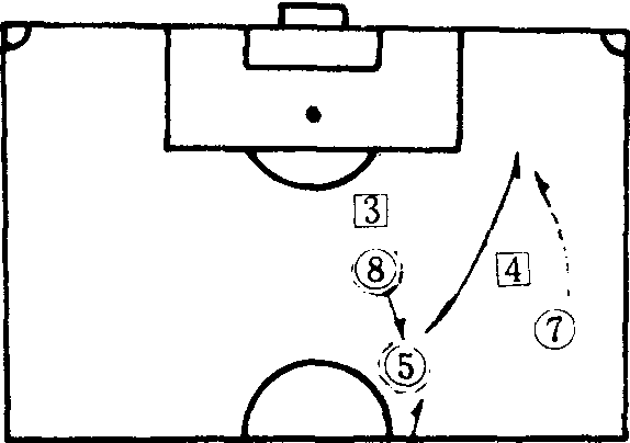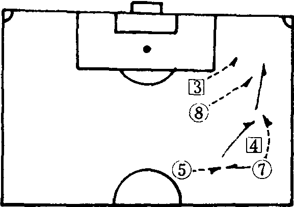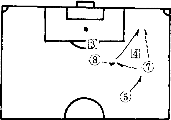 ❶控球人摆脱了防守。5号摆脱防守后,把球传给回撤的7号,7号横传给8号,8号斜传给切入的5号;5号摆脱防守后,把球传给7号,7号横传给8号,8号斜传给切入的7号。