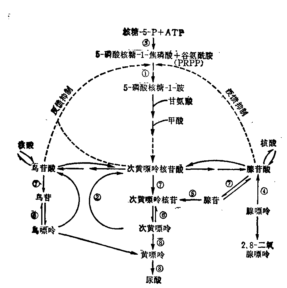 释义 | Lesch-Nyhan综合征Lesch-Nyhan syndrome简称LNS,系一种先天性嘌呤代谢缺陷疾病。为X-连锁隐性遗传,病人均为男性,其母为杂合子。本病是由于次黄嘌呤鸟嘌呤磷酸核糖转移酶先天性缺乏而引起。该酶存在于人体各种组织细胞内,分裂迅速的细胞内活力尤高,如脑、红细胞、白细胞、肝、生殖细胞等,故可表现出这些器官组织受损害的症状。临床可有智力低下、舞蹈样动作、强直性脑性瘫痪、强迫性自残行为及高尿酸血症、尿酸尿、血尿、尿路结石等。可因肾功能衰竭而死亡。本病口服别嘌呤醇可降低血尿酸浓度,服重碳酸钠可防止尿结晶形成。 Lesch-Nyhan综合征 Lesch-Nyhan综合征本病系由于次黄嘌呤鸟嘌呤磷酸核糖基转移酶 (又称HGPRT)缺乏,嘌呤合成失调所致。主要表现为神经系统症状与高尿酸血症。属X连锁隐性遗传。国外男性发病率约为1:10 000。 ❶酰胺磷酸核糖基转移酶; ❷次黄嘌呤鸟嘌呤磷酸核糖基转移酶; ❸5-磷酸核糖-1-焦磷酸合成酶; ❹腺嘌呤磷酸核糖基转移酶; ❺腺苷脱氨基酶; ❻嘌呤核苷磷酸化酶; ❼5′-核苷酸酶; ❽黄嘌呤氧化酶。 ☚ 糖原贮积症Ⅰ型 褐黄病关节炎 ☛ Lesch-Nyhan综合征 Lesch-Nyhan综合征本综合征仅见于男性,幼年发病,属性联遗传,发病机理为次黄嘌呤-鸟嘌呤磷酸核糖转移酶缺乏,鸟嘌呤、次黄嘌呤转变为鸟嘌呤核苷酸、次黄嘌呤核苷酸受抑制,1-焦磷酸-5-磷酸核糖利用减少而积累,由酰胺移换酶催化的反应因而加强,嘌呤合成增多、尿酸生成增加,血尿酸增高,尿排出尿酸显著增多,形成尿酸结晶。婴儿发病者常因在尿布中发现橙黄色细砂样结晶而被注意。次黄嘌呤-鸟嘌呤磷酸核糖转移酶不足,神经系统只能通过主要途径合成嘌呤核苷酸,以致三磷酸腺苷和叶酸等辅助因子缺乏,影响神经系统的发育和功能。临床上以神经系统损害为突出。典型表现:患者出生时正常。4~6月后逐渐出现锥体外束和锥体束受损的症状,如肌肉强直、肌肉无力、手足舞蹈徐动、发音困难,以至发展为关节挛缩,下肢呈剪刀样,髋关节脱位; 精神智力发育迟缓,身材矮小。萌牙后有咬伤自己的手指、唇和颊部粘膜等强迫性自我伤害行为,为本病的突出表现之一。泌尿系尿酸结石亦较常见。至于痛风性关节炎、痛风石和痛风性肾病是否出现,决定于病人寿限和高尿酸血症持续时间。早期诊断十分重要。筛选试验可测尿的尿酸与肌酐比值,在本病中明显增高; 确诊须测定次黄嘌呤-鸟嘌呤磷酸核糖转移酶。胎儿期羊水检查亦有助诊断。治疗上,高尿酸血症的处理原则与原发性痛风相同,即使用别嘌呤醇以控制尿酸生成过多,以防治肾和关节损害。但对神经症状只有对症处理,目前尚乏有效的预防和治疗方法。 ☚ 假性痛风 铁代谢 ☛ |