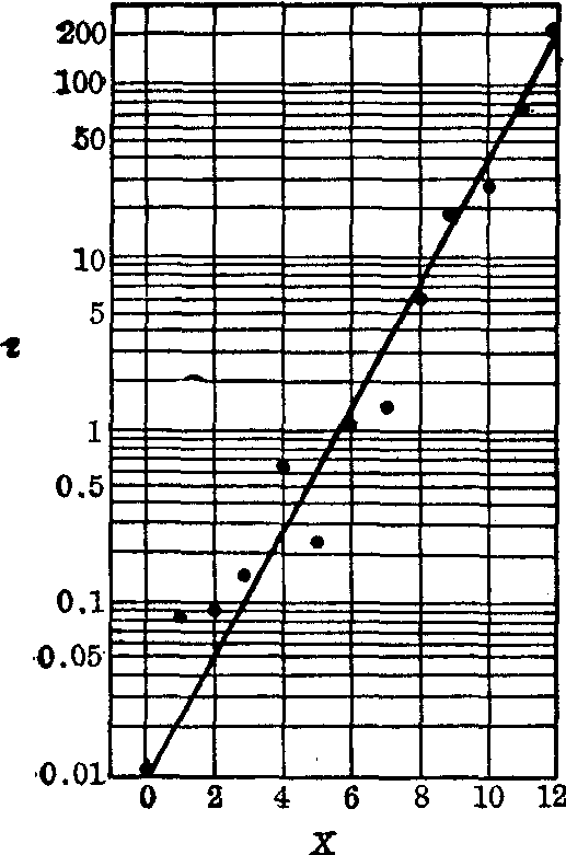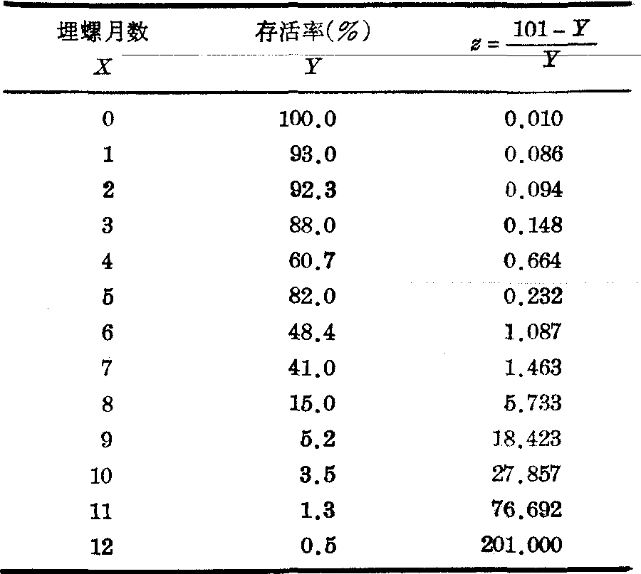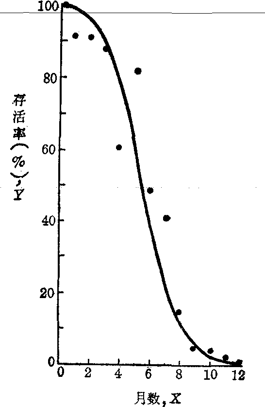 (1)将(X,Y)点画于方格坐标纸上,得图1。由此图形确定K与L,并计算z。按钉螺存活率最终将降至0%,故选下渐近线L=0;又开始土埋时都是活钉螺,拟合曲线的起点应为(0,100),则上渐近线必须略高于100,试取K=101,由式(4)得 z值见表1。 (2) 以 (X,z)在半对数纸上作图,见图2,观察点呈直线趋势。 (3)用目测法作直线,见图2。 图1 拟合logistic曲线 (4)确定拐点。由图2目测, ![]() 图2 图1观察点的直线化 (5)求斜率b及截距a。在图2目测直线上选两点: (0,0.01),(11,100),按x=X-5.5并将z值化成对数,得(0-5.5,lg0.01),(11-5.5,lg100);即(-5.5,-2),(5.5,2)。于是直线的斜率为: (6)将K=101,L=0,a=1,b=0.837304,代入式(1)得 (7)取X=1,2,3,…,12;求得相应的x与Ŷ如下: