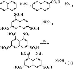 又称1-氨基-6-磺酸基-8-萘酚-3-磺酸钠。 灰色针状结晶粉末。相对分子质量341.30。难溶于冷水,易溶于热水,溶于乙醇、乙醚。 在碱性溶液中呈紫红色荧光,遇三氯化铁呈棕红色。 常温下具有 结晶水,较为稳定。 用途:主要用作反应染料,也用作直接染料、酸性染料、媒染染料、H酸衍生物等的原料,如制造直接染料黄26、黄44、橙6、红79、蓝15、绿59、黑19,酸性染料黄98、红33,媒染染料黄1、黄3、黄5、黄38、橙1、橙6,反应染料黑5、红22、红3、红4、红12、红17、红21、红41、红81、紫2、紫4、紫5等;乙酰基H酸、苯甲酰基H酸、苯甲酰磺酰基H酸等的原料。 制法:以萘为原料,用发烟硫酸磺化,制得β-萘磺酸,再用三氧化硫进一步磺化,制得3,6,8-三磺酸萘,进一步在低温下,用硝酸硝化,制得1-硝基-3,6,8-三磺酸萘,再在铁催化剂作用下还原,制得1-氨基-3,6,8-三磺酸萘(即科赫酸Koch’s acid),再进行盐析,可制得科赫酸钠盐,最后在加压下,加热至180~190℃,再加入碱,熔融,最后制得[1]。