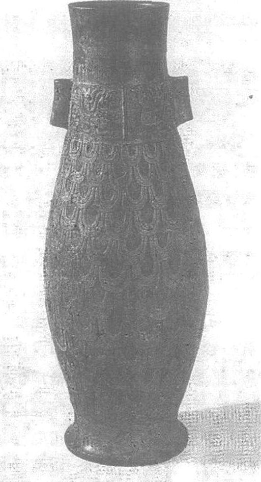 释义 | “ “父庚”铜壶西周。高38.1厘米,口径8.4厘米,底径11.2厘米。重2.87公斤。上海博物馆藏。此壶高颈,深腹,圈足,盖缺失。颈部两侧有贯耳。颈饰对称的多齿冠凤纹,凤冠柔曲似花朵状,凤爪已不显著,宽尾下垂。多齿冠在凤纹的冠型中比较少见。腹部满饰重叠鳞纹,是西周早期较晚之器,或在早中期之际。1954年陕西省长安普渡村西周墓出土周穆王时代青铜器,其中一壶的形制纹饰与此相似。此壶纹饰流行至西周中晚期。壶口沿内有铭文五字,记正为父庚作祭器。 ☚ “叔仓父”铜盨 “甲”铜簋 ☛ |