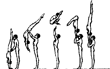 技巧双人抛接动作,双人项目中等难度动作之一。由两人面向站立开始,“上面人”于地上成倒立后,“下面人”托其腰上抛,经屈体、分腿向前翻转1周,成“下面人”屈臂手上倒立。练习过程,“上”成倒立时须紧腰顶肩,在“下”托持其腰两侧时,稍向前翻,使重心稍前移。随即“下”屈膝后蹬起,顺势托“上”向后上抛,并于抛离瞬间向上后抖腕,以形成前翻力矩。与此同时,“上”迅速梗头、分腿立上体。随着腾起顺势低头、提腰髋前翻,两臂主动下伸。此时“下”积极举臂接“上”手,随之屈臂,并稍屈膝缓冲调节“上”之重心,在其顶肩并腿紧腰成倒立后成直立。初学时可先练习手倒立后托腰上举,以训练托抛能力,同时利用弹板练习屈体前跳成平倒立。熟练后借助滑车保护带进行完整练习,或在保护下完成。保护者站“下”前侧方。当“上”抛起前翻时,托持其腰、腹,帮助腾空翻转及下撑成手倒立。