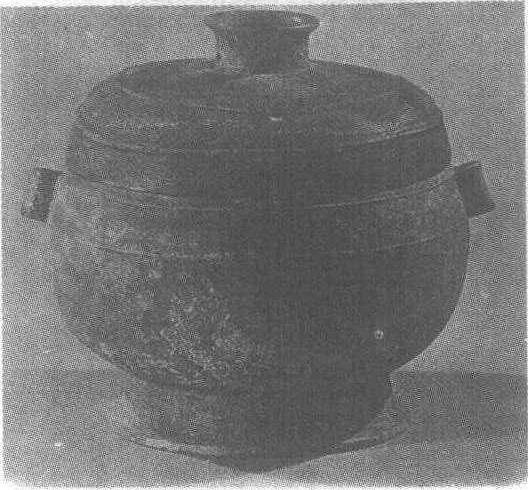 西周。盛食器,礼器。通高14厘米,口径15厘米,腹11.4厘米。重1.6公斤。陕西省岐山县蔡家坡出土。陕西省岐山县文化馆藏。此簋有盖,小贯耳,鼓腹,圈足。盖与器子母合口,盖上有喇叭形提手。提手与圈足各有一对圆孔,与小贯耳上下相对。盖沿和口沿各饰两道弦纹。盖内和器内底各铸铭文: “中作旅簋”四字,字体工整峻挺,有早期大波磔之遗风。中簋自铭为“旅簋”,其“旅”字为行旅之旅,当为旅行途中的用器,并且造型极为罕见,是现存商周青铜器簋类中最为特殊的标本,十分珍贵。