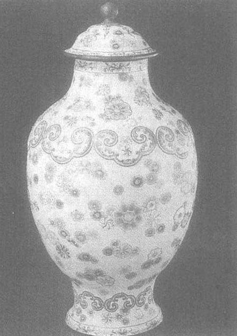 释义 | “乾隆年制”画珐琅盖罐 “乾隆年制”画珐琅盖罐清。通高38.7厘米,口径9.3厘米,足径12.2厘米。北京故宫博物院藏。罐为铜胎镀金。圆形,阔肩收腹,带盖。通体以白釉为地,饰大小不等的各式皮球花,肩及足部各锤饰凸起的云头纹一周。足内为白地,中心部蓝双线圆框内直书双行“乾隆年制”楷书款。此罐为养心殿造办处珐琅作造。 ☚ 掐丝珐琅带盖梅瓶 锤胎珐琅双耳瓶 ☛ |