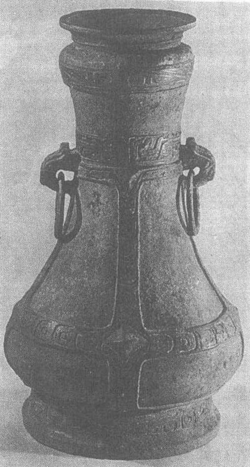 西周。盛酒器。通高54.5厘米,口径15.6厘米,腹深40.8厘米,最大腹径32厘米。重14.45公斤。1975年陕西省岐山县董家村窖藏出土。陕西省岐山县文化馆藏。此壶直口,长颈,垂腹,圈足。盖上有喇叭状提手,两侧兽首衔环双耳。盖顶饰窃曲纹,颈部饰垂冠回首分尾鸟纹,腹部交错饰以带状鳞纹,盖沿和圈足为三角雷纹。器内壁和盖内对铭,各铸16字,记仲南父作尊壶。此器构图简练,美观大方,应为懿、孝时期遗物。