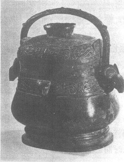 西周。盛酒器。通梁高24厘米,口径13.5×10.5厘米,腹深12.7厘米。重3公斤。1978年陕西省扶风县齐家村出土。陕西省周原文物管理所藏。此卣有盖,体作低矮,垂腹,圈足。盖上有喇叭状提手,盖面两侧铸有“犄角”,提梁的两端呈羊首形。盖沿及口沿下均饰以云雷纹填地的垂冠回首夔龙纹带。口沿下增饰浮雕羊首。提梁饰蝉纹,圈足有两道弦纹。盖内及器底对铭,各铸铭文“作宝尊彝”四字。此器极富时代特征,与丰卣一样是西周昭、穆时期的典型器物。