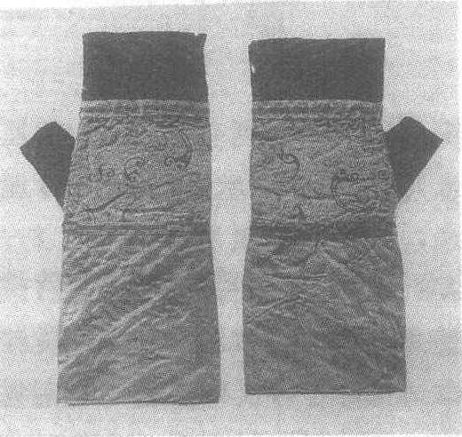 释义 | “信期绣”绢手套 “信期绣”绢手套西汉。通长24.8厘米,上宽9.4厘米,下宽11厘米。1972年湖南省长沙市马王堆1号汉墓出土。湖南省博物馆藏。手套作直筒露指式,手掌面绢地为“信期绣”,正裁,缝在拇指上下,边缘镶饰“千金绦”两道;指部和腕部均用1/4幅绛色绢,斜裁,按螺旋方式缝合成筒状,再折为里、面两层,拇指部分另加布简并上侧有缝,腕部口无毛边。“信期绣”见“‘信期绣’褐色罗绮锦袍”条目。“千金绦”纹样由“千金”文字、雷纹、波折纹三种组成,分阴阳各异的两个单元纹饰,呈绛红色调,色彩古朴。 ☚ 素纱禅衣 “信期绣”罗绮香囊 ☛ |
