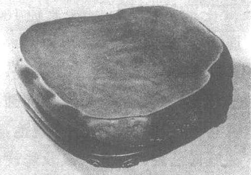 清。通长24厘米,宽23厘米,高3.5厘米。天津市艺术博物馆藏。用广东肇庆端石制成,石质密润,砚依石形作圆形,边未加磨璞,砚面微凹,砚背有描金线山水图:峰峦层叠,飞瀑高悬,山脚下密林遍布其间,枝叶茂盛苍翠,石径、水亭、寺塔、屋宇掩映林中,山前坡石起伏缓平,一道宽平的河流环绕于山脚之下,水势平缓,渔舟客船游荡其中,一座小桥横跨两岸。整砚画面构图自然,刀法流畅,在上部阴刻有“印心石屋山水全图”八字。“印心石屋”是陶澍的室名。陶澍(公元1778—1839年),字子霖,安化(今湖南)人,嘉庆七年(公元1802年)进士,改翰林院编修,官至巡院,工书近北碑,著有《印心石屋文集》、《渊明集辑注》。