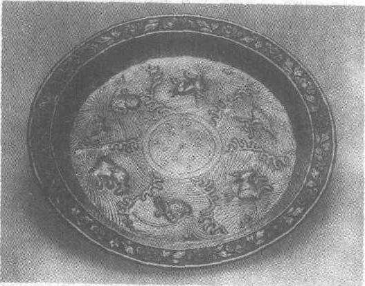 释义 | “周卿”海兽纹银圆盘 “周卿”海兽纹银圆盘宋。通高1.5厘米,口径17.5厘米。1983年四川省遂宁县出土。四川省文物管理委员会藏。此盘系银质,内錾刻翻卷的浪花,浪花中有凸起的龙、马、鱼、象、龟等动物图案,图案中间刻弦纹两道和14个小圆圈。盘边装饰牡丹花一周。底部刻款“周卿”二字。 ☚ “成都市平”铁权 “东阳可久”如意纹银瓶 ☛ |
