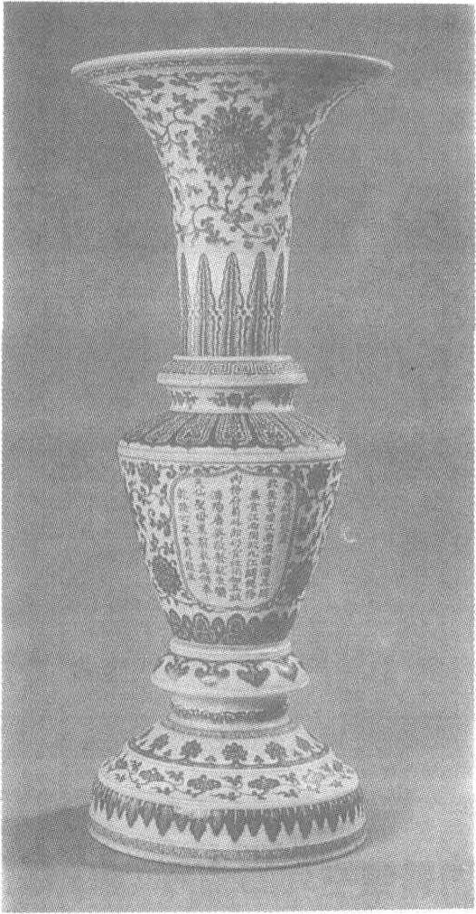 释义 | “唐英敬制”青花缠枝莲纹觚式瓷瓶 “唐英敬制”青花缠枝莲纹觚式瓷瓶清乾隆。高63.5厘米,口径26.5厘米。北京中国历史博物馆藏。此瓶仿商周时代的青铜觚形制,撇口,喇叭颈,折肩,尊形腹,覆盆式足。通体以青花绘制多层纹饰,有蔓草纹、缠枝菊、蕉叶纹、回纹、莲瓣纹及云头纹等。纹饰繁密,具有明代宣德时期的构图风格。青花呈色浑厚、沉着。瓶身有青花书写的68字楷书款,其中有“唐英敬制”字样。唐英(公元1682—1756年),奉天(沈阳)人,雍正元年担任内务府员外郎,到景德镇佐理陶务,任驻御器厂协理官,对窑务悉心研究,取得了很大成就,为中国陶瓷业做出了杰出贡献。其著述有《陶人心语》、《陶冶图说》等。《清史稿》中有唐英传。 ☚ “乾隆年制”珐琅彩花卉纹瓷瓶 “大清乾隆年制”松石绿釉瓷梅瓶 ☛ |