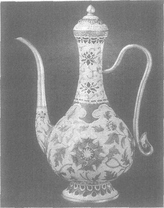 释义 | “嘉庆年制”画珐琅执壶 “嘉庆年制”画珐琅执壶清。通高23.9厘米,口径4.4厘米,足径7.1厘米。北京故宫博物院藏。养心殿造办处珐琅作造。壶为铜胎镀金。圆形,细长颈,长流高柄,圈足外撇。通体以黄釉为地,颈部饰彩花四朵,间缀勾莲纹。肩部饰蓝釉垂云一圈,腹部饰牡丹花叶和大花。足内为白地,中心部的蓝方双框内写双直行“嘉庆年制”楷书款。 ☚ 锤胎珐琅双耳瓶 掐丝珐琅方罍 ☛ |
