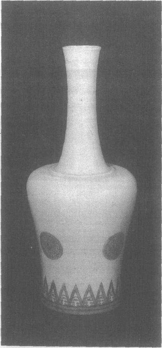 清。高23厘米,口径3.2厘米。天津市艺术博物馆藏。釉里红是以铜红料为着色剂,在瓷胎上彩绘,罩一层透明釉后在120℃左右的还原气氛中一次烧成。这种工艺始于元末,至明宣德时期已出现一些成功之作,但以后又一度衰退。清康熙时期这一传统品种得到发展,取得了仅次于青花的卓越成就。此瓶口微撇,颈细长,平肩,腹部微向下收。通体施白釉,晶莹润泽。腹中部以铜红料绘古镜图案四个。近底处绘大锯齿纹一周,锯齿纹内有云纹。釉里红呈粉紫色,将素净淡雅的瓷瓶装点出几分妖媚。图案细笔描绘,线条清晰,如同刻画一般,底部有“大清康熙年制”青花款。