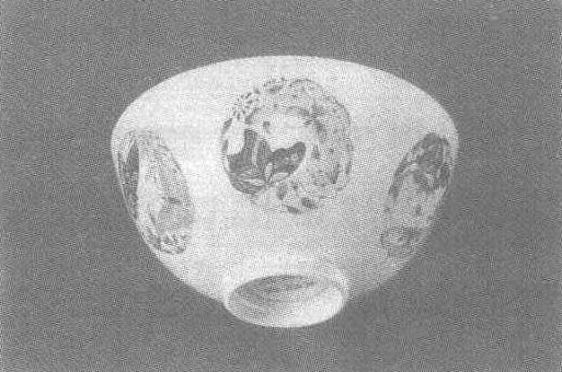 清。高6.6厘米,口径13.4厘米。北京故宫博物院藏。珐琅彩创烧于康熙中期,是从铜胎珐琅移植而来。至雍正时期,技术发展达到一个高峰,改变了康熙时期在涩胎上作画的方法,而在白瓷釉上精工彩绘,制作更趋精进。此碗圆唇,弧形深腹,小底,圈足,所施白釉极为细润。碗身绘团花五组,每组有两只彩蝶在花间飞舞。画工精致,花卉的阴阳面和蝶翼的纹络清晰可辨。所用色彩极为丰富,即使同一颜色也显示不同层次,且鲜艳而不失雅逸,是雍正珐琅彩的代表作。底有“大清雍正年制”款。
