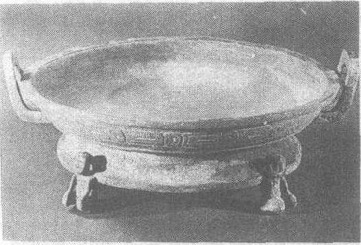 西周。通高14.1厘米,口径40.4厘米,腹深6.8厘米。重8.3公斤。1963年陕西省扶风县齐家窖藏出土。陕西省博物馆藏。此盘平沿,双附耳,圈足下有四个受过刖刑的裸体男子作小足,人用跪坐式,双手扶滕,腿屈于臀下,肩负重盘。腹部及耳面均饰重环纹。圈足上饰斜角夔纹。器内底铸一铭文“它”字。此器当属西周晚期之物。