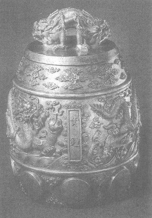 释义 | “康熙五十四年制”金黄钟 “康熙五十四年制”金黄钟清。高21.2厘米,纽高6厘米,厚1.2至2.1厘米,上径13.6厘米,中径20.6厘米,下径16.2厘米。重24500克。北京故宫博物院藏。此钟为金编钟之首——黄钟。外形椭圆,顶和口部皆平,双龙纽。钟身錾刻云龙纹,一面竖錾“康熙五十四年制”字样;一面竖錾“黄钟”二字。黄钟的音调属于现代E调的“1”。金编钟亦称金钟,用纯金制成,是皇帝举行大典时使用的乐器之一。全套编钟共有16枚,与铜编钟不同之处是没有大小之分,只是钟壁有厚有薄,因此敲击时也能发出不同的音阶。全套金编钟总重为460818克。 ☚ 金爵、金托 “乾隆年制”嵌珠宝“金瓯永固”金杯 ☛ |