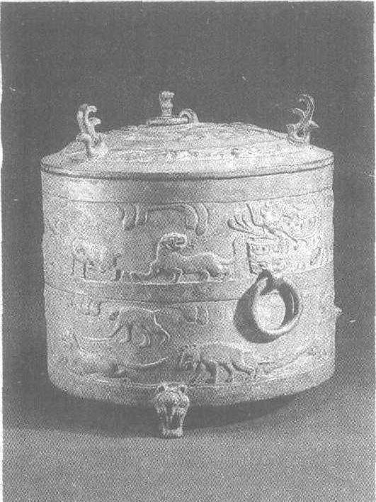 西汉。古代盛酒或温酒的器具。通高25厘米,口径23厘米,壁厚0.4厘米。1962年山西省右玉县大川出土。山西省博物馆藏。此为圆筒形。有盖微凸,正中有提环,周围有三个雕凤钮,内外有两周花纹:内周围绕中间的提环,对称地刻有虎、羊各二;外周和凤钮平行,在钮的中间各有一龙纹。腹部两侧有铺首衔环相对称,上下缘及腰均饰宽带,上层右旋有猿猴、骆驼、牛、兔、羊、鹿、虎、立兽、乌鸦、鸿雁等,下层右旋有虎、狐狸、鹿、羊、熊、猿猴、鹅、鸭和背生羽翼的异兽等。器下部有三熊矮足。口沿及盖下的子唇外沿均刻隶体铭文:“中陵胡傅铜温酒,重二十四斤,河平三年造。”此器通体铸造花纹,异常精美。尤其是腹部上下两层的鸟兽纹饰,技法高妙,生动逼真。