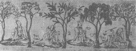 南朝。均长240厘米,宽88厘米。1960年江苏省南京市西姜桥东晋大墓出土。江苏省南京博物院藏。此为墓室两壁的砖刻画,由近三百余块墓砖组拼。其制作过程是:先在整幅绢上画好内容,而后分段刻成木模,印在砖坯上,再在每块砖的侧面刻上序号,待砖烧就后,依次拼对而成。此画一幅由左向右绘嵇康、阮籍、山涛、王戎,一幅由右向左绘何秀、刘伶、阮咸、荣启期。前七人,即史称的“竹林七贤”(魏晋间的文人名士,崇尚清谈,据南朝宋刘义庆《世说新语·任诞》云:“七人常集于竹林之下,肆意酣畅”)。荣启期则是春秋时的高士。八人均席地坐于树下,或弹琴、或饮酒、或弄如意,或品茗……神态怡然,各具个性。此砖画线条刚柔相济,人物形象比例匀称,花纹衔接紧密,拓印出来,俨然一幅完整的人物画。这是迄今所发现的最早的两晋时期的砖画作品,有关学者认为它有三绝,其一为迄今所见最早的魏晋人物画,其二为现存的首幅竹林七贤画,其三为创造了历史人物画的新模式。