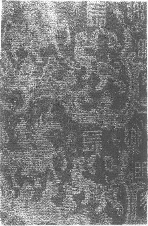 “长乐明光”锦 “长乐明光”锦东汉。残长49厘米,宽10厘米。1980年新疆维吾尔自治区罗布泊西岸楼兰故城东7公里高台墓地2号墓出土。新疆维吾尔自治区社会科学院考古研究所藏。此锦以宝蓝色作背景,用褐、绛、草绿三色作经线显花,纹样以卷云纹为骨干,穿插以各种动物,并缀以吉祥铭文。在浮动的云纹中,有一长翼的怪兽。一匹作奔跑状的马,上坐一人。一只回首吠叫的狗。在狗头上方织一隶书“长”字,“长”的右侧,隔着云纹织有隶书“乐明光”,与“长”字相互辉映。锦的经纬密度经线每平方厘米46根,纬线26根。“长乐明光”四字,寄寓吉祥之意。