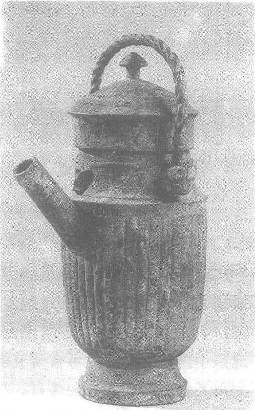 商。古代盛酒器。通高25.1厘米,口径7.5厘米。传河南省安阳市出土。北京中国历史博物馆藏。此盉有盖和绳形提梁。盖钮帽饰涡纹,盖面饰斜角云纹带。器颈饰夔纹带,中间有小兽首,腹部饰直纹,下敛,上有管状直流,流上饰蕉叶纹。圈足饰云纹。提梁作绳形,两端饰兽耳,与器身两侧突出的两耳形短柱相套接。此器当是先铸成提梁和兽首,放置陶范内再行浇铸成器,然后将兽首泥芯磨碎,其中即成空隙,提梁便可自由活动,内底有铭文“马永”二字,马是商代氏族徽号,永是作器者名,此种形制的盉,在商代青铜器中甚为少见。
