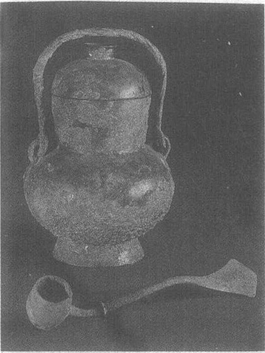 释义 | “鱼父己”铜卣(附勺) “鱼父己”铜卣(附勺)西周。古代盛酒器。通高20厘米,口径9厘米,勺长21厘米。1961年河南省鹤壁市庞村西周墓出土。河南省博物馆藏。此卣直口,高颈,鼓腹,圈足。盖上有一圆形钮。肩部两侧各有一环形鼻,安一绳索状提梁。素面无纹,附斗形勺一把。器盖与器底同铭,各有“雀鱼父己”四字。雀从亚从雀,当是族徽。鱼为作器人名,已为鱼之父,此器系鱼为祭祀其父而作的器物。 ☚ 弦纹铜盉 “白”铜簋 ☛ |