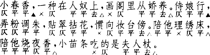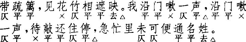 释义 | 一江风 一江风和睦州作。存有稿本。未见。庄一拂《古典戏曲存目汇考》云:“二卷,三十六出,演郑梓、高静女事。” ☚ 鹔鹴裘 百花梦 ☛ 一江风 一江风汤显祖 《牡丹亭》 ![]() 全曲十句:3▲,5△,5△。3▲,4,4,5△。5△,5△,5△。 其二 梁辰鱼 《浣纱记》 ![]() ![]() 全曲十句:3▲,5△,5△。3▲,4,5△。5△,(叠)5△,5△,5△。第一体和第二体的区别:第一体第五、六两个四字句,第二体只用一句;第一体第八、九两个五字句,第二体第八句叠一句;前者较多一个四字句,后者较多一个五字叠句,都是十句体。有以第一体称为古体,第二体称为今体者。这种古、今体之分,并不十分妥当。所谓今体,只是因为后人普遍应用而得名;其实,其起源却也是很古的,早期南戏如《白兔记·祭赛》、《荆钗记·绣房》中就已出现了。后来又有一种综合体,既用两个四字句,又用五字叠句,就成为十一句体,如《纳书楹四梦曲谱》,将《牡丹亭》古体〔一江风〕第八句“陪他理绣床”,仿照今体用一叠句;《西楼记·疑谜》(演出本称《拆书》)即如此处理。另一种综合体,前面只用四字一句,后面五字句又不叠,成了九句体,《荆钗记·团圆》即如此作,后来无人从之。〔一江风〕叠用二支或三支成套,用在一出戏的开头。《紫钗记·边愁写意》、《牡丹亭·肃苑》叠用四支,较少见。亦有单用一支,作出场用,前面不用引子,如《西楼记·疑谜》、《清忠谱·缔姻》,颇为通行。《白兔记·说计》〔一江风〕用在后部,后来少见。亦可组成专场,短的如《燕子笺·闺痊》用二支,长的如《娇红记·访丽》用六支。小令常用。以〔一江风〕为主的集曲有〔单调风云会〕,见《南词简谱》。 ☚ 节节高 香罗带 ☛ 一江风 一江风民间曲调名。基本曲格为八、五、五、七、五、五、三、七,第五句(五字句)重复一遍。可加衬字,平仄通叶,亦有变格,首句亦可作三五句。清乾隆间流传。可单曲使用,如《霓裳续谱》卷四的《暗悲伤懒把妆台向》、《步西园舟结连环案》等;也可与他曲联套,如同书卷七《双双手儿捧玉钟》由〔南叠落金钱〕与〔一江风〕联套,同书最后的《万寿庆典》“四段第 三”《吉祥瑞草》,则由〔万寿祝〕、〔吉祥草〕、〔一江风〕三曲联套。在联套中,〔一江风〕每每用作尾声。 ☚ 岔曲 玉沟调 ☛ 一江风 南曲牌。属南吕宫过曲。《九宫大成南北词宫谱》正格为:三五五、三四四五、五五五六,共11句7韵。例:“老书堂,暂借扶风帐,日暖钩帘荡。那回廊,小立双鬟,似语无言,近看如何相,(合)问你恩官在那厢,恩官在那厢,夫人在那厢,女书生怎不把书来上。”(《牡丹亭》)又有别体5体,共6体,其变异之处主要是缺第6句4字句,其余则无出其规范。《南词定律》正格则与《九宫大成》变体同,即第5句下少一句4字句,为:三五五、三四六、五五五六,共10句7韵20板。例:“问他家,独自穿山径,趁几曲溪流净。未开门,一带疏篱,见花竹相遮映。(合)沿门嗽一声,沿门嗽一声,待敲还住停,急忙里未可通姓名。”(《浣纱记》)其第6句6字也可作5字。按此调第7、8两句5字句(《九宫大成》正格中则是第8、9两句)例作叠句。 一江风yì jiāng fēng曲牌名,属南曲南吕宫,一般用作过曲或代替引子:奔腾而澎湃,江间波浪兼天涌,须要铁锁缆孤舟,既遇着~,不宜出行。(六二·1463)按,这是史湘云说的一个酒令。要用一句古文,一句旧诗,一骨牌名,一曲牌名,一句时宪书。 一江风 一江风曲牌名。属南曲南吕宫。字数定格及韵式,据清·周祥钰《九宫大成谱》 作三、五、五、三、四、四、五、五、五、六 (十句)。第八句可复唱。一般用作过曲,有时也代替引子。如昆剧《春香闹学》春香上场时所唱。又通名〔一官迁〕。昆剧《百顺记·召登》中王曾带军兵巡抚江南,行路时用此曲,头一句是“一官迁”,京剧中即用此名。常用于齐唱,以唢呐锣鼓配合,烘托多人行路的气势。如《法门寺》太后出行时所用。 ☚ 隔尾 粉蝶儿 ☛ 一江风 一江风笛曲。详见“花香蜂舞”。 ☚ 一勾勾 一枝花 ☛ |