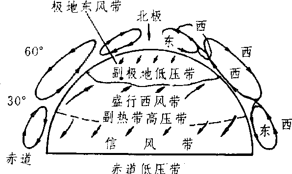 释义 | 三圈环流3-cellmeridional大气环流中的平均经圈环流。是只考虑太阳辐射的纬度差异和地球自转作用而形成的环流模式。在经圈垂直剖面图上,三圈环流是由低纬和高纬地区的两个按逆时针方向旋转的正环流圈以及中纬地区的一个按顺时针方向旋转的较弱的逆环流圈所组成,并分别出现在南北半球上。上述南北半球各形成的3个垂直环流圈,反映了全球大气运行总的概貌,即属一级环流。三圈环流的形成,在对流层的低层,南北半球各产生了三个风带。如北半球从低纬到高纬,分别为东北信风带、盛行西风带和极地东风带。 北半球三圈环流模式和风带分布 |