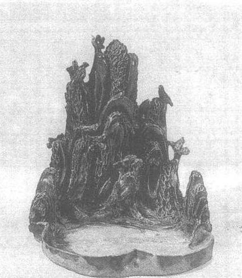 | 释义 | 三彩假山 三彩假山唐。通高18厘米。1959年陕西省西安市西郊中堡村唐墓出土。陕西省博物馆藏。唐三彩是唐代陶器和陶俑上的一种多色釉。所谓三彩实为多彩之意。釉质的主要成分是硅酸铝,呈色剂为不同的金属氧化物,施釉于陶胎后在1000℃以下的低温中烧成。其主要产地为陕西西安和河南洛阳。这件三彩器为花园中的假山水池模型。如黛的青山下傍一池清水,几只小鸟在山村间栖息或振翅,纯属大自然的一个缩影,特别是假山的塑造和施釉极富山村韵味。与此模型同时出土的还有两座凉亭、八间房子和三个极小的女俑,由此可见唐代贵族邸宅庭院之豪华气派。