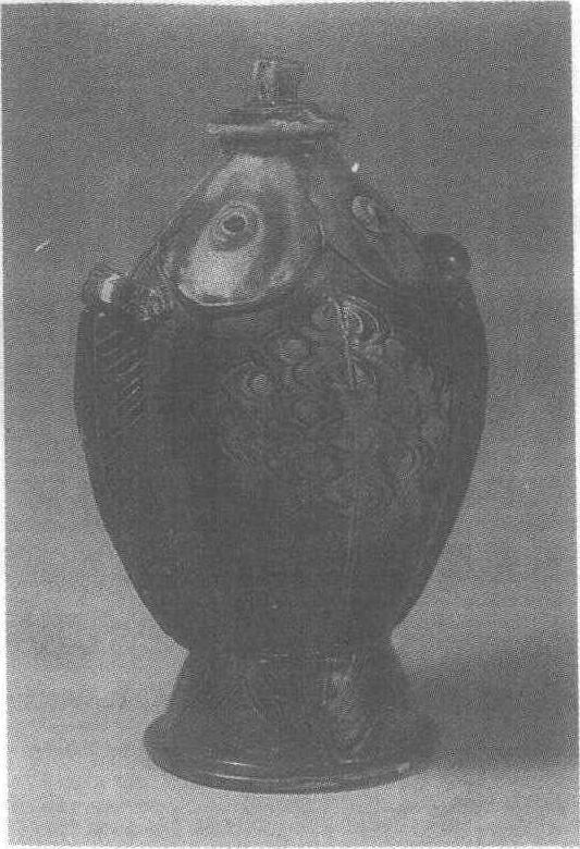释义 | 三彩双鱼瓶 三彩双鱼瓶唐。高24.5厘米,口径4.1厘米。山东省益都县出土。山东省博物馆藏。唐三彩是盛行于唐代的低温铅釉陶,在素烧的胎体上施以色釉,置800℃窑中焙烧。因有斑驳瑰丽的多种颜色,故称“三彩”。品种有生活用品和艺术性很高的雕塑品。此瓶身由双鱼组合而成,两条鱼脊构成瓶壶的两侧,鱼背之上有双环供系绳之用。腹部中央有一条竖线,为两鱼相贴的分界线。周围饰圆状纹,象征鱼鳞。瓶的圈足上刻有代表鱼尾的纹饰。通体以黄、绿、褐三色装饰。构思新颖奇特,色彩鲜艳而雅丽,是唐三彩中的优秀之作。 ☚ 始皇诏陶量 瓷器 ☛ |