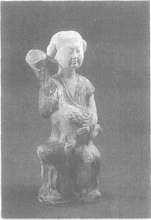 唐。高34厘米。1987年山西省长治市李度墓出土。山西省考古研究所藏。一位天真稚气的少女坐于束腰形墩上,其发辫整齐地盘在头后。脸型饱满,面带纯洁的微笑。整个头部未施釉。内穿短袖衫,外着半臂裙襦,右腿翘于左腿上,呈“二𨄂腿”式。怀中抱一只鸭形壶,鸭嘴向上大张衔住壶嘴。少女的身上和鸭形壶上施以朱红、淡黄、赭石、淡绿色釉,色泽浓郁莹润。此俑造型生动活泼,少女的神态甜美亲昵,怀中的鸭形壶造型逼真,恰似一只肥美的鸭子,是众多三彩俑中难得的珍品。它出土于有确切纪年的唐墓,具有更高的科学研究价值。唐三彩见“三彩鸭式杯”条目。