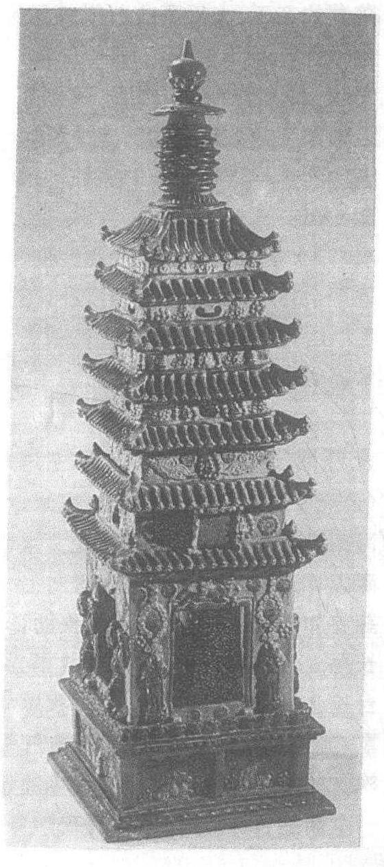 释义 | 三彩舍利塔 三彩舍利塔北宋。高98厘米。1966年河南省密县法海寺旧址北宋塔墓出土。河南省博物馆藏。这是一件仿砖塔结构的模型,塔身共七层,第三层以上可拆卸分做两节。基座为叠涩须弥式,上饰兔、伏鹿、宝塔等图案。第一层塔身甚高,每面开门,内各坐佛一尊。两侧和门额贴饰力士、天王、麒麟及宝相花等图案。第二层以上各层均开形制不同的假窗,并贴有装饰。塔檐上有仿制的筒瓦和板瓦,塔刹由相轮、宝珠等七层组成。通体施绿、黄、褐色釉。造型精美,色彩瑰丽。二层塔身刻有“咸平二年四月二十八日记施主仇(知)训”的题记,咸平二年即公元999年。 ☚ 石女侍俑 建鼓舞画像石 ☛ |