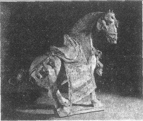 释义 | 三彩陶马唐代。高40.1、身长45、宽24厘米。釉面莹润,釉层厚薄不匀,三彩以黄、绿、白中透绿色为主。马作直立状,三蹄着地,左前蹄扬起,头侧向右下方形成弓形,体态矫健,骨肉停匀。头部小而颈粗长,目光下视,两耳竖立,缚尾长鬃,鬃毛分披,纹理整齐。鬃毛边线从头部向下雕有汗水流淌的效果。马具装饰华丽,两耳下、前胸、股后的鞦两侧均饰有缨络,其堆塑有立体感。各类马具一应俱全,表现出征前战马扬蹄嘶鸣的艺术造型。现藏旅顺博物馆。 三彩陶马 |