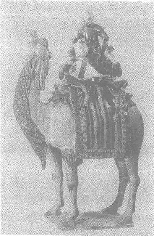 释义 | 三彩骆驼载乐俑 三彩骆驼载乐俑唐代陶塑。共两件。一件为*鲜于庭诲墓俑之一,系首次发现的此类俑。骆驼通高58.4厘米,首尾长43.4厘米,昂首而立。全身施白釉,颈、前腿、膝关节等处局部施赭黄釉。驼背垫圆毡垫,上有木架; 架上铺边饰绿穗的五色条纹长毡,两端下垂至驼腹以下。木架平台上有五个高25.1厘米的乐舞俑。其中二汉人和二胡人面向外坐,分别持琵琶、笛子等乐器作演奏状; 中间立一中年胡人,面向前方,身穿绿色圆领窄袖长衣,右手向前伸出,左手后撤,作歌舞状。表情生动,姿态刚劲优美。这是唐三彩中极其精彩的作品。另一件在1959年6月出土于西安市西郊中堡村唐墓。形制与前件相仿,只是所载乐俑为七人,形体也略小。从同时出土的其他俑推断,所处时代稍晚于鲜于庭诲墓载乐俑。 ☚ 鲜于庭诲墓俑 俾失十囊墓俑 ☛ 三彩骆驼载乐俑 三彩骆驼载乐俑唐代陶塑。共两件。一件为*鲜于庭诲墓俑之一,系首次发现的此类俑。骆驼通高58.4厘米,首尾长43.4厘米,昂首而立。全身施白釉,颈、前腿、膝关节等处局部施赭黄釉。驼背垫圆毡垫,上有木架; 架上铺边饰绿穗的五色条纹长毡,两端下垂至驼腹以下。木架平台上有五个高25.1厘米的乐舞俑。其中二汉人和二胡人面向外坐,分别持琵琶、笛子等乐器作演奏状; 中间立一中年胡人,面向前方,身穿绿色圆领窄袖长衣,右手向前伸出,左手后撤,作歌舞状。表情生动,姿态刚劲优美。这是唐三彩中极其精彩的作品。另一件在1959年6月出土于西安市西郊中堡村唐墓。形制与前件相仿,只是所载乐俑为七人,形体也略小。从同时出土的其他俑推断,所处时代稍晚于鲜于庭诲墓载乐俑。 ☚ 鲜于庭诲墓俑 俾失十囊墓俑 ☛ 三彩骆驼载乐俑 三彩骆驼载乐俑唐。通高66.5厘米,长42厘米,宽19.9厘米。陕西省西安市鲜于庭诲墓出土。北京中国历史博物馆藏。这是一件名气极大的三彩器,有很高的历史价值和艺术价值。骆驼昂首直立,形体高大健壮,颈部及前肢上端有黄褐色长毛,背部驼架上平铺花条呢质长毯,两端垂至腹部以下。上有五个乐舞俑,歌者一,奏乐者四。中立者穿绿色长衫,目视前方,挥舞手臂放声歌唱。围绕于四周的奏乐者面朝外而坐,其中一人手持琵琶弹拨,另外三人的乐器已失。歌者和二奏乐人为深目、高鼻、虬髯,是西洋人形象,余二人为汉人。根据史料记载,唐代中国的丝、纸、陶等商品经丝绸之路传入西域的同时,西域的服装、音乐也传入我国。这件载乐俑的发现,为文字记载提供了有力的实物依据。所表演的可能是唐代乐师融西域乐曲而创作的“胡部新声”。陕西省博物馆藏有一件与此类似的骆驼载乐俑,但歌舞奏乐者皆为典型的汉人。唐三彩见“三彩鸭式杯”条目。 ☚ 三彩马及牵马俑 三彩马 ☛ |
