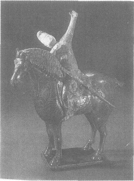 唐。高36.2厘米,长30厘米。1972年陕西省乾县懿德太子墓出土。陕西省博物馆藏。此俑是迄今发现的罕见的一件绞胎瓷塑,十分珍贵。绞胎为唐代陶瓷业的一种新工艺,是用褐、白两色瓷土相间揉合在一起,而后拉胚成型。胎体上留下白褐相间的木纹状纹饰,透过釉色清晰可见。此马立于长方形踏板上,首微俯,双目圆睁,耳上竖,似奔跑后的喘息状,马骠肥体壮,全身罩一层褐黄色釉。前额和颈部的鬃毛浓密而整齐。马背铺一毡垫,上骑一佩剑武士。武士头戴幞头,穿圆领绿长衫,腰缠丝带,足蹬尖头靴,双腿紧夹马肚,侧身回首仰天,手高举做拉弓射箭状。作者匠心独具,将相对静止的骏马和射手千钧一发将有作为的两个客体完美地结合在一起,有张有弛,形成强烈的对比,是难得的艺术佳作。唐三彩见“三彩鸭式杯”条目。