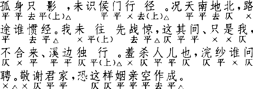 释义 | 三换头 三换头梁辰鱼 《浣纱记》 ![]() 全曲十一句:4△,4△。4,4△。4△,6,7△。5,5△。4,7△。第五、六、七句三句一段,有一些不同作法:如《春芜记·言谢》只作两句,第一支“道你是金华时彦,又道姮娥爱少年”。第二支“这其间喜得你,佳人竟垂清盼”。《彩毫记·展叟单骑》也作两句,但句式又相异,第一支“焉肯助乱阶,这的是毕竟被名为祸媒”;第二支“难免目下灾,这其间一定有神明救解”。〔三换头〕常叠用二支,与〔东瓯令〕联用,亦可单用,或以一支入套。 ☚ 东瓯令 刘泼帽 ☛ 三换头 三换头三叠词每段开头句式不同者,称为三换头。如苏轼《戚氏》三段,前段开头是三字句,中段起句为六字,第三段又换成五字句。此外,如周邦彦《兰陵王》、张元幹《宝鼎现》等皆是每叠换头,与双曳头者前二段往往相对是不相同的,不可混淆。 ☚ 双曳头 转调 ☛ 三换头 三换头有些三叠词,三段开头的句式都互不相同,称为“三换头”。如《兰陵王》、《戚氏》等。 ☚ 过拍 结拍 ☛ |
