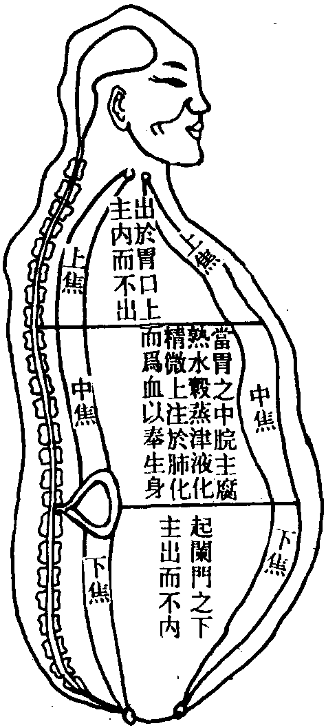 释义 | 三焦 三焦中医认为三焦为人体内脏六腑之一,指食道、胃、肠等部分及其生理机能。《难经·荣卫三焦三十一难》:“三焦者,水谷之道路,气之所终始也。上焦者,在心下下膈,在胃上口,主内而不出。……中焦者,在胃中脘,不上不下,主腐热水谷。……下焦者,当膀胱上口,主分别清浊,主出而不内以传导也。” ☚ 侍生帖 望闻问切 ☛ 三焦 三焦中医学名词。六府之一。主要功能为疏通水道与主持气化。《素问·灵兰秘典论》:“三焦者,决渎之官,水道出焉。”明张景岳注: “决,通也。渎,水道也。”《难经·三十八难》称三焦有“主持诸气”的作用。例第五十四回: “太医澄心定气,候得脉来,却是胃虚气弱,血少肝经旺,心境不清,火在三焦,须要降火滋荣。” ☚ 血虚 太医 ☛ 三焦 三焦中医学名词。六府之一。主要功能为疏通水道与主持气化。《素问·灵兰秘典论》:“三焦者,决渎之宫,水道出焉。”《难经·三十八难》称三焦有“主持诸气”的作用。传统健身法中,以手臂上举的动作来增强三焦的功能。《八段锦》:“两手托天理三焦”。 ☚ 经筋 经络 ☛ 古代名物 > 人體類 > 其他部 > 名類 > 三焦 三焦 sānjiāo 爲人體六腑之一,分上焦、中焦、下焦三部分。其功能爲主疏道和主持諸氣。其稱始見於先秦典籍,今沿稱。《素問·靈蘭秘典論》:“三焦者,决瀆之官,水道出焉。”《難經·三十一難》:“三焦者,水穀之道路,氣之所終始也。” 三焦圖 (《醫宗金鑒》) 三焦triple warmer六腑之一。是上、中、下焦的总称。它是脏腑外围最大的腑, 又称外腑、孤腑。对三焦的形态与功能,从古至今都无定论。《难经》创立三焦有名无形说, 宋代陈言认为三焦是脂膜, 明代虞抟和张介宾认为三焦系“腔子”,清代罗东逸认为三焦即胃,清代唐容川则主张三焦为全身之油膜。有人认为三焦的实质近似淋巴系统;也有人认为是胸腹膜、网膜, 或体液调节系统, 或植物性神经系统等, 其说不一。现一般认为它不是一个独立的器官, 而是某些脏腑及其部分功能的概括。从部位来说, 上焦主要指膈以前的胸部(包括心、肺两脏); 中焦指脘腹部 (包括脾、胃等脏腑); 下焦指脐以后的腹后部(包括肝、肾、大小肠及膀胱等脏腑)。《司牧安骥集》“胡先生清浊五脏论”: “头至于心上焦位, 中焦心下至脐轮, 脐下至足下焦位,此是三焦亦要明。”上焦的功能是司呼吸,主血脉, 将水谷精微敷布于全身; 中焦的功能是腐熟水谷, 运化精微; 下焦的功能是分清别浊, 并将糟粕以及代谢后的水液排泄出体外。《黄帝内经·灵枢》:“上焦如雾, 中焦如沤, 下焦如渎。”就是对三焦功能的总概括。水谷的受纳、腐熟, 到精微的运化、敷布、代谢产物的排泄, 均与三焦有关, 而这些功能又都是通过气化作用来完成的, 所以三焦又具有总司诸气, 疏通全身水道的作用。 三焦❶六腑之一。是脏腑外围最大的腑,又称外腑、孤腑。有主持诸气,疏通水道的作用。《难经·三十一难》:“三焦者,水谷之道路,气之所终始也。”《素问·灵兰秘典论》:“三焦者,决渎之官,水道出焉。”分上焦、中焦、下焦三部。《灵枢·营卫生会》:“上焦出于胃上口,并咽以上,贯膈而布胸中,……中焦亦并胃中,出上焦之后,……下焦者,别回肠,注于膀胱而渗入焉。”三焦手少阳经脉,与手厥阴心包经互相络属。 三焦tripe warmer中医学名词。六腑之一。是上焦、中焦、下焦的总称。从部位分,膈以上为上焦,自脐以上为中焦,脐以下为下焦。就功能而言,上焦司呼吸主血脉.中焦腐熟水谷,下焦分泌清浊。 三焦六腑之一。分上、中、下三焦。其具体所指至今仍不明确,有以下几种说法: 三焦 三焦中医名词。为上焦、中焦、下焦的合称,属于六腑之一。历史上对三焦是有形还是无形,争议颇大。三焦无形说认为它虽有功能,而无实体;三焦有形说则认为它是人体脏腑之外躯体之内的包罗诸脏器的一个很大的腑,又称“孤腑”。近代有的学者进一步提出三焦相当于人体淋巴系统或组织间液,但多数学者将三焦作为一种部位和功能的单位。例如上焦在横膈以上,下焦在脐以下,中焦则位于横膈与脐之间。三焦各自的功能与其所在部位的脏器功能相近。上焦主宣发,通过心、肺向全身输布水谷精微,使精微物质如雾露升腾弥漫(所谓“上焦如雾”);中焦乃脾胃所居之地,能腐熟水谷、消化吸收其精微(所谓“中焦如沤”);下焦通过肾与膀胱的排尿及大肠的排便作用,去除体内糟粕(所谓“下焦如渎”)。将上、中、下三焦合而观之,则三焦的功能可归纳为升降气机,通调水液,完成人体的水液代谢过程。三焦的病变主要表现在气机和水液代谢方面。分而言之,上、中、下三焦各自的病变也就是它们所在部位中各脏腑的病变。至于中医温病学说中的三焦辨证,是温病过程中用以探讨病机变化的一种辨证方法。其内容既与脏腑中的三焦有密切关系,又有某些特殊之处。 ☚ 心包络 女子胞 ☛ 三焦上焦、中焦、下焦的合称。六腑之一。主要功能是:1.主持诸气,总司全身的气机和气化功能,是气升降出入的通道。2.疏通水道,运行水液,是水液升降出入的通道。手少阳三焦经与手厥阴心包经相络属。 三焦sān jiāo❶中医藏象中六腑之一。主要功能为疏通水道与主持气化。《素问·灵兰秘典论》:“三焦者,决渎之官,水道出焉。” 三焦sānjiāo❶六腑之一。是脏腑外围最大